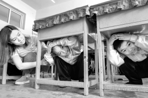 右图: 邢台市逸夫小学的学生在参加防震演练。