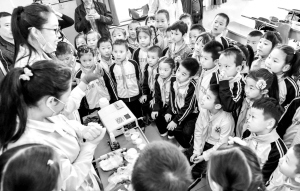 5月20日,检测人员给学生们介绍如何通过药剂颜色的变化识别农药残留程度。当日,新疆乌鲁木齐农产品质量安全检测中心的工作人员来到乌鲁木齐市新疆教育学院实验小学,为小学生们上了一堂生动的实验课。