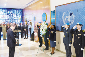 联合国秘书长潘基文当天在联合国总部向殉职维和人员敬献花圈,并带领在场的联合国官员和各国外交人员默哀一分钟,提前纪念5月29日联合国国际维和人员日。
