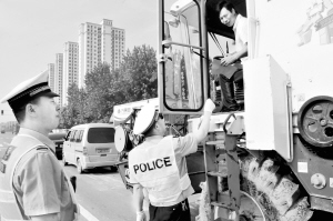 昨日,周口大道执勤交警为来往收割机驾驶员送上温馨提示宣传页。随着麦收临近,南来北往的收割机械通过我市境内,沿途交管部门及时为机械手提供帮助,希望他们顺利到达机收工作现场。记者 沈湛 摄