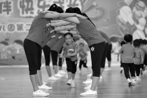 5月31日,在广西桂林市龙胜各族自治县民族体育馆,孩子们和家长表演亲子操。