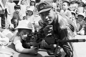 5月31日,武警安徽总队第一支队的战士在指导小朋友进行射击训练。