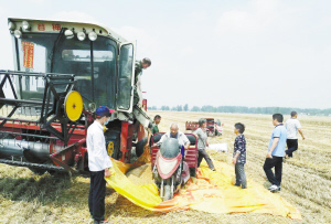 正值小麦收获时节,沈丘县莲池镇积极引导群众抓住晴好天气抢收,确保小麦颗粒归仓。图为5月30日,该镇农民正在抢收小麦。 张林亚 摄