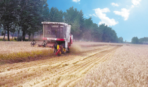 麦收期间,刘庄店镇要求作业收割机必须安装秸秆粉碎机,做到收割、脱粒、秸秆还田一步到位。图为在该镇作业的收割机同时将秸秆粉碎还田。 李宁 摄