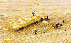 6月2日,在扶沟县的一麦田里,农民正在装车外运成捆的小麦秸秆。扶沟县农机局采取敞开补贴的方法,鼓励农民购置小麦秸秆打捆机械,有效解决了秸秆禁烧难题,既减少了大气污染,又增加了农民收入。 张力友 摄