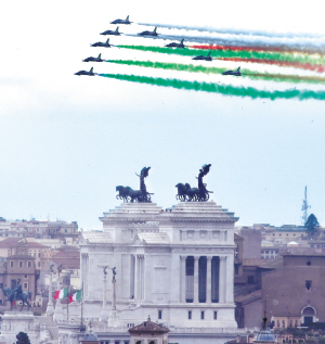 6月2日,在意大利罗马,特技飞行队在空中拉出代表意大利国旗颜色的红白绿三色烟雾,庆祝意大利共和国成立70周年。