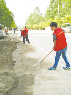 “两城一区”创建以来,县直各单位对所辖卫生区进行集中整治。图为县教体局志愿者在对新民中路的垃圾进行清扫。曹参团 王楠静 摄