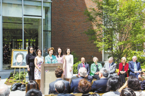 6月6日,在美国波士顿的哈佛大学,美国福茂集团董事长赵锡成的长女、美国前劳工部长赵小兰(左三)在剪彩仪式上讲话。哈佛大学建校380年来首栋以华人命名的教学楼赵朱木兰中心6日在哈佛商学院举行剪彩仪式,宣告正式启用。这也是哈佛商学院首栋以女性命名的建筑。赵朱木兰中心是美国福茂集团董事长赵锡成及其家族基金会2012年对哈佛大学4000万美元的捐赠项目之一,以赵锡成已故妻子命名。 新华社发