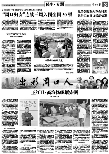 本报讯(记者 窦娜 通讯员 姜晓光 刘双博)记者昨日获悉,在日前全国妇联进行的地级市妇联微信公众号综合排名中,我市“周口妇女”微信号连续三周进入全国50强。据介绍,这是全省唯一获此殊荣的市级妇联。