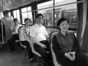 仪式结束后,罗文阁、李全林等试乘了新开通的公交车。(左图)