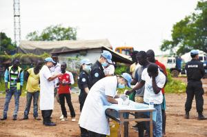 6月11日,中国第四支驻利比里亚维和警察防暴队一级医院的医护人员深入蒙罗维亚自由港港区,开展“你我携手·共护健康”义诊活动。医护人员携带便携式医疗器械及常用药品为港区工作人员进行体检,宣讲埃博拉、疟疾等传染性疾病防范常识,赠送防蚊药品,并将检查结果详细记录,交给该港区负责人存档。
