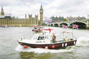 6月15日,在英国首都伦敦泰晤士河上,“脱欧派”渔船船队参加造势活动。