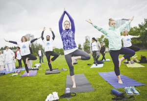 6月19日,来自大温哥华地区的民众在加拿大萨里市集体练习瑜伽,迎接国际瑜伽日。