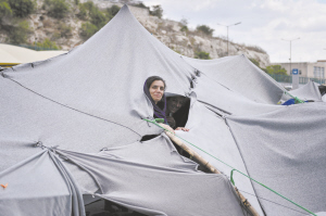 图②:2016年5月18日,在希腊比雷埃夫斯港的一处临时难民营,一名叙利亚妇女从一座由毯子搭建成的帐篷内向外张望。