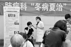 “冬病夏治”正当时 6月21日,山西省中医院医生在市民的耳朵上贴敷。当日是农历二十四节气中的夏至,山西省太原市许多市民来到山西省中医院,接受“冬病夏治”中医疗法。新华社发