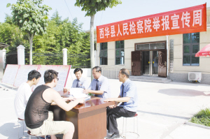6月20日上午,西华县检察院以“加强举报人保护,惩治群众身边腐败”为主题的第十八个“举报宣传周”活动在该院控告申诉举报接待室拉开序幕。活动现场,干警们向过往群众散发宣传资料,解答群众的法律咨询,并结合宣传资料宣传举报的正确方法和途径,以及保护、奖励举报人的法律法规等相关规定,帮助举报人学会如何举报,如何最大限度地保护自身的合法权益。屈琳琳 理霜 摄