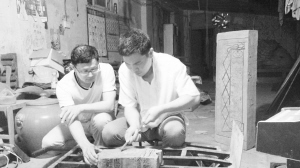 淮阳艺人史兴峰,自幼痴迷书画,尤擅汉砖雕刻,其制作的汉画砖砚,格调高古,醇和典雅,被众多知名书画家和美术馆收藏。图为史兴峰正在进行砖砚艺术创作。