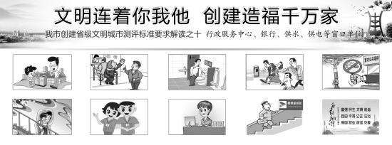 服务场所门前卫生状况良好。 设置“一米线”或叫号系统,文明有序。 卫生间、通道等能正常使用。 服务场所内外无随地吐痰现象。 有明显禁烟标志,无吸烟现象。 消防通道畅通,逃生导向标识清晰、规范。 工作人员着装规范、挂牌上岗。 服务设施齐全、有咨询等便民服务设施。 安装电子视频监控系统,并有明显标志。 醒目位置有社会主义价值观公益广告。 设计 王朝辉
