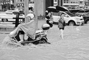 重庆发布暴雨洪灾三级预警 6月24日,重庆市江北区石马河转盘处积水严重,市民涉水出行。当日,重庆市气象台发布暴雨橙色预警信号,重庆多地将出现暴雨或大暴雨。新华社记者 陈诚 摄