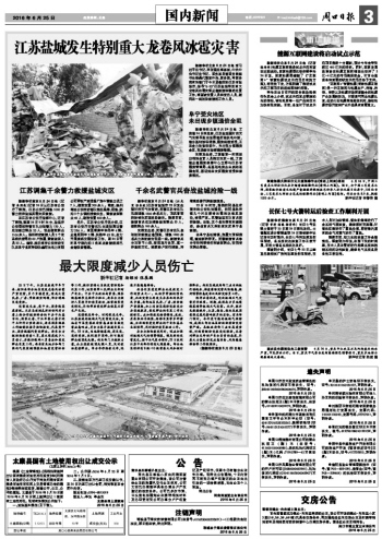 江苏盐城发生特别重大龙卷风冰雹灾害