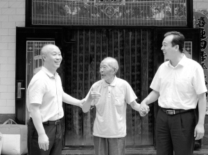 在王明荣家中,李明拉着老人家的手,详细询问了他的身体状况和家庭情况,并送上慰问金和诚挚的祝福,感谢他在抗日战争中为党和人民做出的贡献,祝愿老人身体健康、阖家幸福。