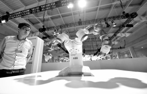 走近达沃斯“流动的创意”展览 6月26日,工作人员在现场展示协作机器人。当日,2016夏季达沃斯论坛在天津梅江会展中心举行。在论坛“流动的创意”展览上,主办方展示了各式各样的智能机器人,吸引了众多参会者参观互动。新华社发
