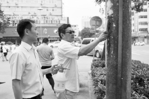 工行周口分行积极响应我市创建省级文明城市提出的倡议,定期组织志愿者开展义务劳动。图为该行志愿者在工农路清理路边小广告。
