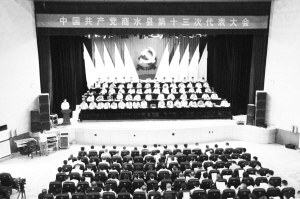 当日的县影剧院被装扮得庄严肃穆,主席台正中央悬挂着金色的党徽,在十面鲜艳的红旗的映衬下,显得格外醒目,“抢抓时代机遇,坚定发展战略,为建设幸福商水实现全面小康而努力奋斗”的横幅,令人鼓舞、催人奋进。