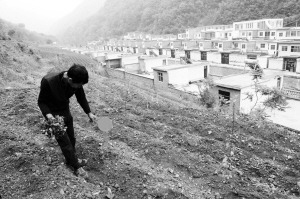 易地搬迁“挪穷窝” 产业扶持“挖穷根” 在河南嵩县木植街乡平地村,一位农民在山坡上栽红薯苗,山坡旁是两排崭新的异地搬迁安置房。位于伏牛深山区的河南省嵩县大胆探索,一手抓易地搬迁,帮助困难群众“挪穷窝”,一手抓特色产业培育,助力困难群众“挖穷根”,取得明显效果。新华社发