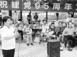 7月1日早晨,我市近百名离退休老人在滨河公园自发举行庆祝中国共产党成立95周年文艺演出。这些老人分别来自周师、中心医院、保险公司等单位,两个小时内他们演唱了《绣红旗》《周口市歌》等40多首歌曲和戏剧片段,表达了我市老年人对党和祖国的衷心祝福。 记者 付永奇 摄