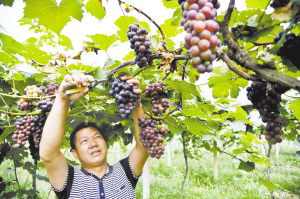 小暑农事忙 7月7日,江西省万载县株潭镇同胜村的丁晨光在采摘葡萄。当日是二十四节气的“小暑”,各地农民抓住农时,加强田间农作物管理,为丰收打好基础。新华社发