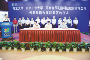 上午11时,在张维宁、张全兴、张震宇、徐光等领导嘉宾的鉴签下,南京大学副校长谈哲敏、南京工业大学副校长乔旭、河南金丹科技董事长张鹏三方共同签署战略合作协议。