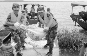 7月11日,武警抚州市支队官兵在鄱阳县柘港乡潼丰联圩大堤庆丰段从渔船上搬运沙袋。