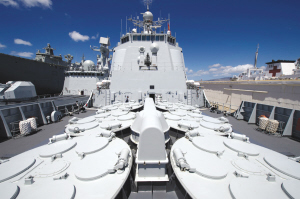 参加“环太平洋-2016”演习的中国舰艇编队静待出海 7月10日在美国夏威夷珍珠港拍摄的中国海军导弹驱逐舰西安舰前甲板导弹发射井。参加“环太平洋-2016”演习的中国海军舰艇编队近日陆续完成多项港岸训练计划,扎实做好演习各项准备。新华社发