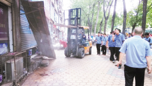7月7日,川汇区组织办事处、城管、公安和分包责任单位干部职工200余人,出动10辆执法车,对汉阳路两侧市容环境难点问题开展集中清理整治行动。 刘巍 摄