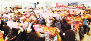 7月13日,在韩国首尔,“萨德”系统部署地星州郡居民手举“反对萨德”标语参加抗议。继韩国国防部日前确定将末段高空区域防御系统(即“萨德”系统)部署在庆尚北道星州郡后,韩国国内对部署“萨德”的目的性、安全性、决策过程等提出种种疑问。由于反对声持续高涨,韩国总统朴槿惠14日紧急召开国家安全保障会议,研究后续推进措施。