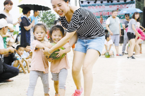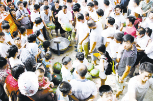 一企业把在西瓜节上认购的西瓜送给环卫工人。