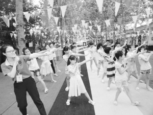 日前,黄淮学院的4名大学生志愿者在舒庄乡扶苏村留守儿童家园教孩子们跳舞。商水县舒庄乡已有20个村创办了留守儿童家园,由老师、大学生村官和大学生志愿者义务担任辅导员,留守儿童在家园里学唱歌、学跳舞、学画画,幸福快乐地过暑假。乔连军 摄
