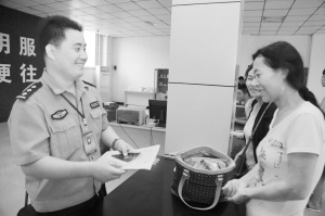 暑假期间,我市很多学生选择出国(境)旅游。市公安局出入境业务办理服务大厅为保证受理、发证工作顺利进行,采取有效措施,全力为群众提供优质、高效、便捷服务。图为民警将办好的港澳通行证交给群众。 郁发顺 摄