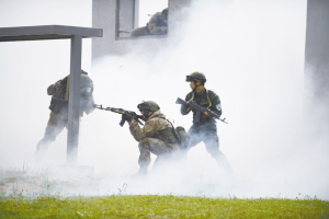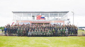 7月14日,在俄罗斯莫斯科“诺夫斯基”训练中心,中俄参训队员进行训练成果汇报。