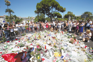 7月16日,在法国南部城市尼斯,人们聚集在恐怖袭击发生地英国人漫步大道悼念遇难者。当日,发生袭击事件的尼斯英国人漫步大道重新对行人开放。大批当地居民和游客聚集这里,摆放鲜花和蜡烛,悼念无辜遇难者。 新华社发