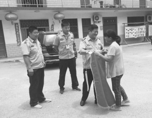 | 近日,郸城县城管监察大队赵志峰、王宝瑞、姜鹏飞、刘雨4人在执法期间,见义勇为,抓获2名小偷,并扭送到派出所。图为失主在向城管监察大队赠送“见义勇为,一心为民”锦旗。 左绍峰 谢孟伶 刘远志 摄 |