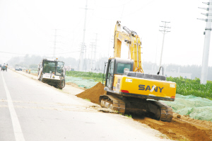 7月13日,项城市南环路东段施工人员正在进行道路拓宽作业。据了解,南环路西段道路拓宽后,已初步完成路面铺筑任务。张永久 李光辉 摄