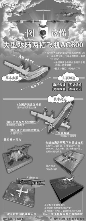 “AG600填补了我国大型水陆两栖飞机的空白,是国家应急救援体系建设急需的重大航空装备,对我国经济发展和转型升级具有重大意义。”中航工业副总经理耿汝光说。