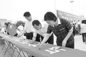 7月20日,为争创省级文明城市,郸城县举行了以“我志愿、我参与、文明交通、文明出行”为主题的文明交通志愿者服务活动,推进城市精细化管理,号召广大市民遵守交通规则,文明出行,全民参与,为创建省级文明城市助力加油。图为郸城县四个班子领导在“文明出行,全民参与”万人宣传条幅上签字。记者卢好亮 通讯员 崔彦林 摄