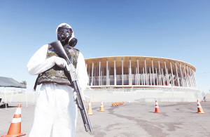 里约安保加强备战 7月28日,在巴西利亚加林查国家体育场内,一名巴西防生化、辐射、核武器部队士兵参与防恐演习。在里约奥运会期间,巴西将组成有史以来最大规模的安保联动队伍,确保里约奥运会安全、顺利地举行。新华社发