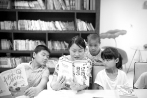 ①安徽省合肥市蜀山区龙居社区活动室内,“蝴蝶妈妈”叶玉芬(中)带着来自安徽寿县的“小候鸟”兄妹、11岁的江博文(左一)和江博雅(右一)一起阅读书籍。