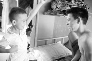 ②安徽省合肥市瑶海区和平路街道一处工地宿舍内,来自贵州凯里的“小候鸟”、7岁的杨志辉(左)给爸爸杨明旭模仿自己喜欢的卡通人物。