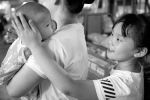 ④安徽合肥市蜀山区浅水湾社区内,来自安徽庐江县的“小候鸟”、9岁的张司晨(右)抚摸自己刚刚3个月大的妹妹张雨晨。