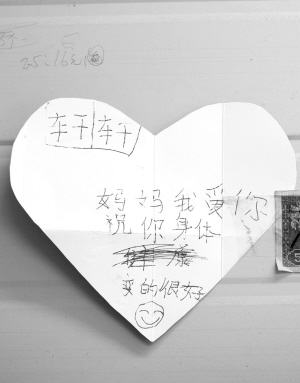 ③安徽省合肥市瑶海区和平路街道一处工地小卖部内,来自湖北潜江的“小候鸟”、7岁的孙雨轩写给妈妈的祝福话语。